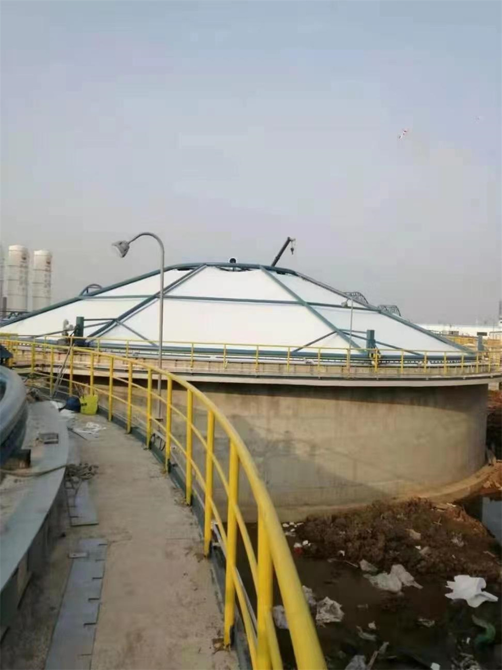 3.施工方面,膜結(jié)構(gòu)的施工均采用專業(yè)的施工團(tuán)隊(duì),對(duì)當(dāng)?shù)氐沫h(huán)境,池體的結(jié)構(gòu)特征,膜結(jié)構(gòu)污水池加蓋的展現(xiàn)形式等進(jìn)行嚴(yán)密的考慮后,再進(jìn)行膜結(jié)構(gòu)污水池加蓋施工,保證每次施工的安全性和質(zhì)量。