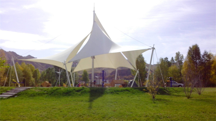 張拉膜結(jié)構(gòu)塑造的景觀小品是被人認(rèn)可并推崇的,它最大的特點(diǎn)是靈活設(shè)計(jì)的造型,對(duì)體量小巧的戶外景觀裝置尤為合適,這體現(xiàn)在一個(gè)“輕”字上面,膜結(jié)構(gòu)所采用膜材材質(zhì)“輕”巧、呈現(xiàn)的外部姿態(tài)“輕”盈飄逸,在施工安裝方面也是“輕”松上陣。