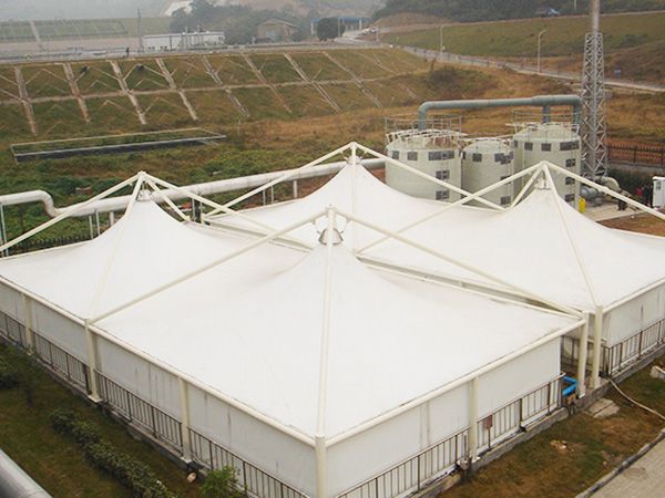 膜結構污水池加蓋是一種新型的處理污水池廢氣的方法,這種方法不僅結構新穎,而且造型優(yōu)美,安裝,維修方便,充分發(fā)揮了膜結構建筑的優(yōu)勢。膜結構污水池加蓋是以鋼結構為主,將膜材反吊的形式進行污水池廢氣除臭。膜結構污水池加蓋作為新型的污水池廢氣除臭方法,在膜材性能,結構安裝和施工方面都具有很大的優(yōu)勢: