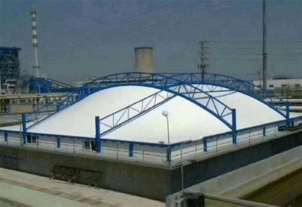 膜結(jié)構(gòu)污水池加蓋是一種新型的處理污水池廢氣的方法,這種方法不僅結(jié)構(gòu)新穎,而且造型優(yōu)美,安裝,維修方便,充分發(fā)揮了膜結(jié)構(gòu)建筑的優(yōu)勢(shì)。膜結(jié)構(gòu)污水池加蓋是以鋼結(jié)構(gòu)為主,將膜材反吊的形式進(jìn)行污水池廢氣除臭。膜結(jié)構(gòu)污水池加蓋作為新型的污水池廢氣除臭方法,在膜材性能,結(jié)構(gòu)安裝和施工方面都具有很大的優(yōu)勢(shì):